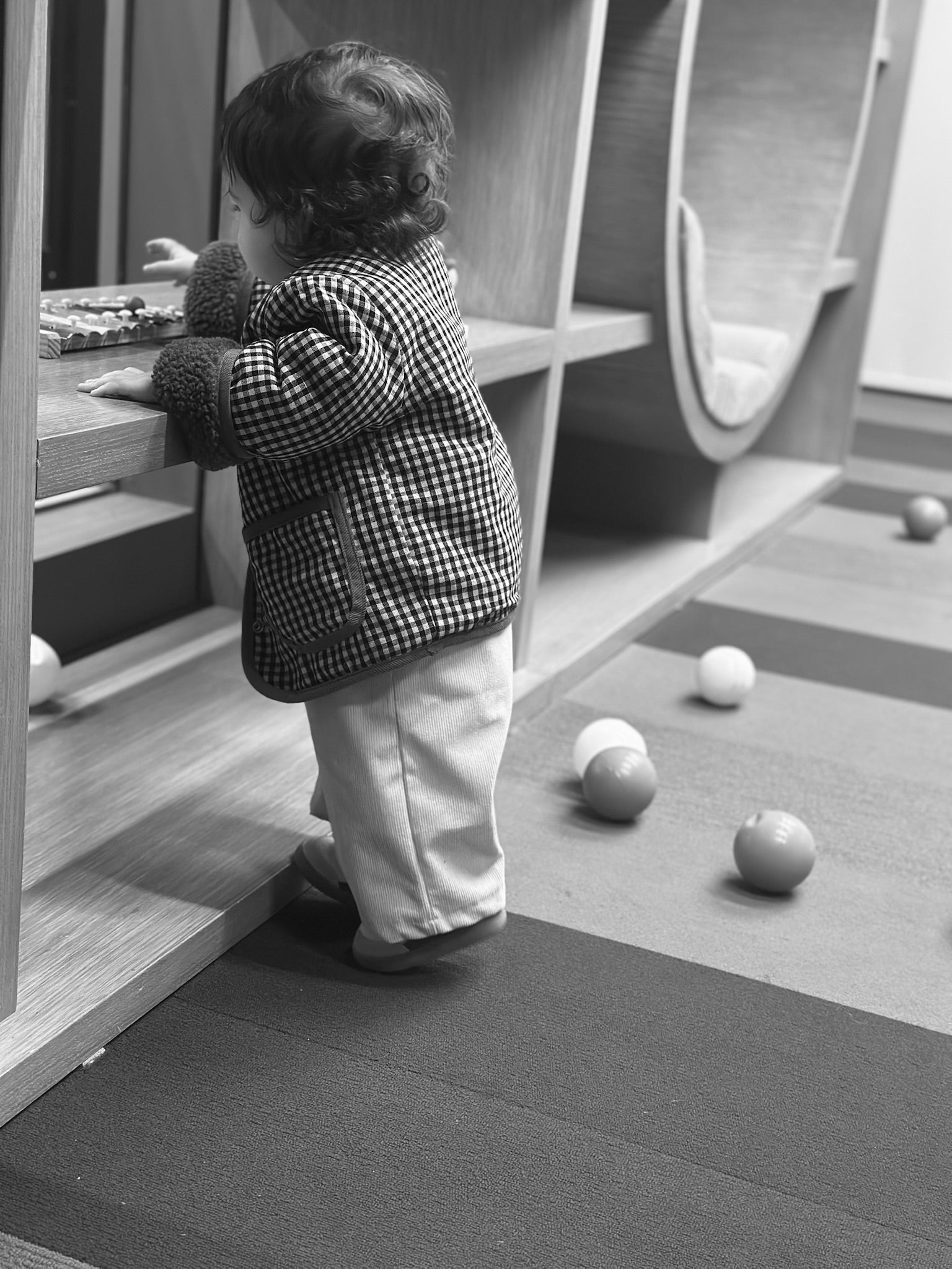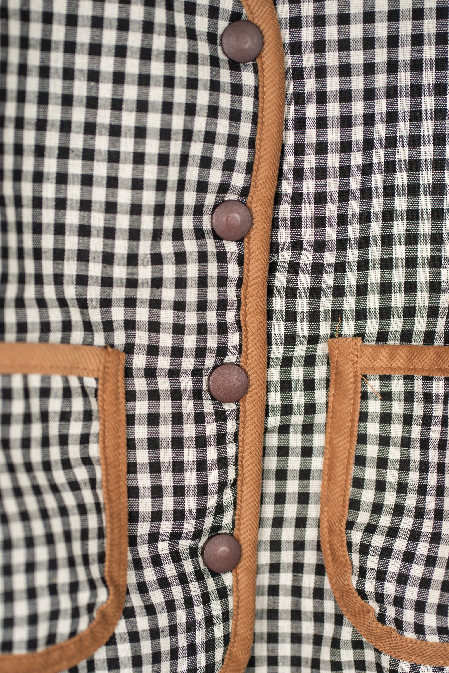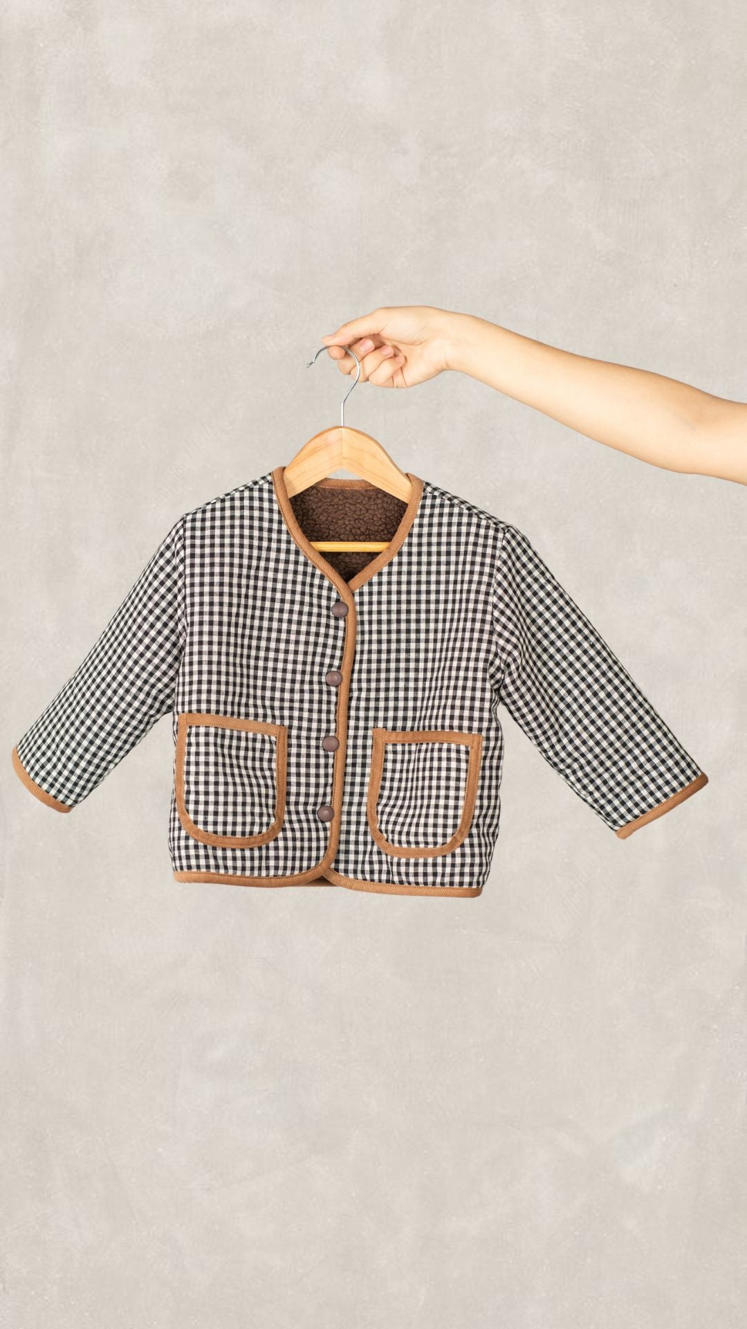 Chamarra con doble vista en diseño de cuadros tipo vichy negro. Cuenta con dos bolsillos funcionales y cierre con botones para un toque clásico. La doble vista ofrece versatilidad en el estilo, mientras que el interior de peluche proporciona calidez y comodidad.