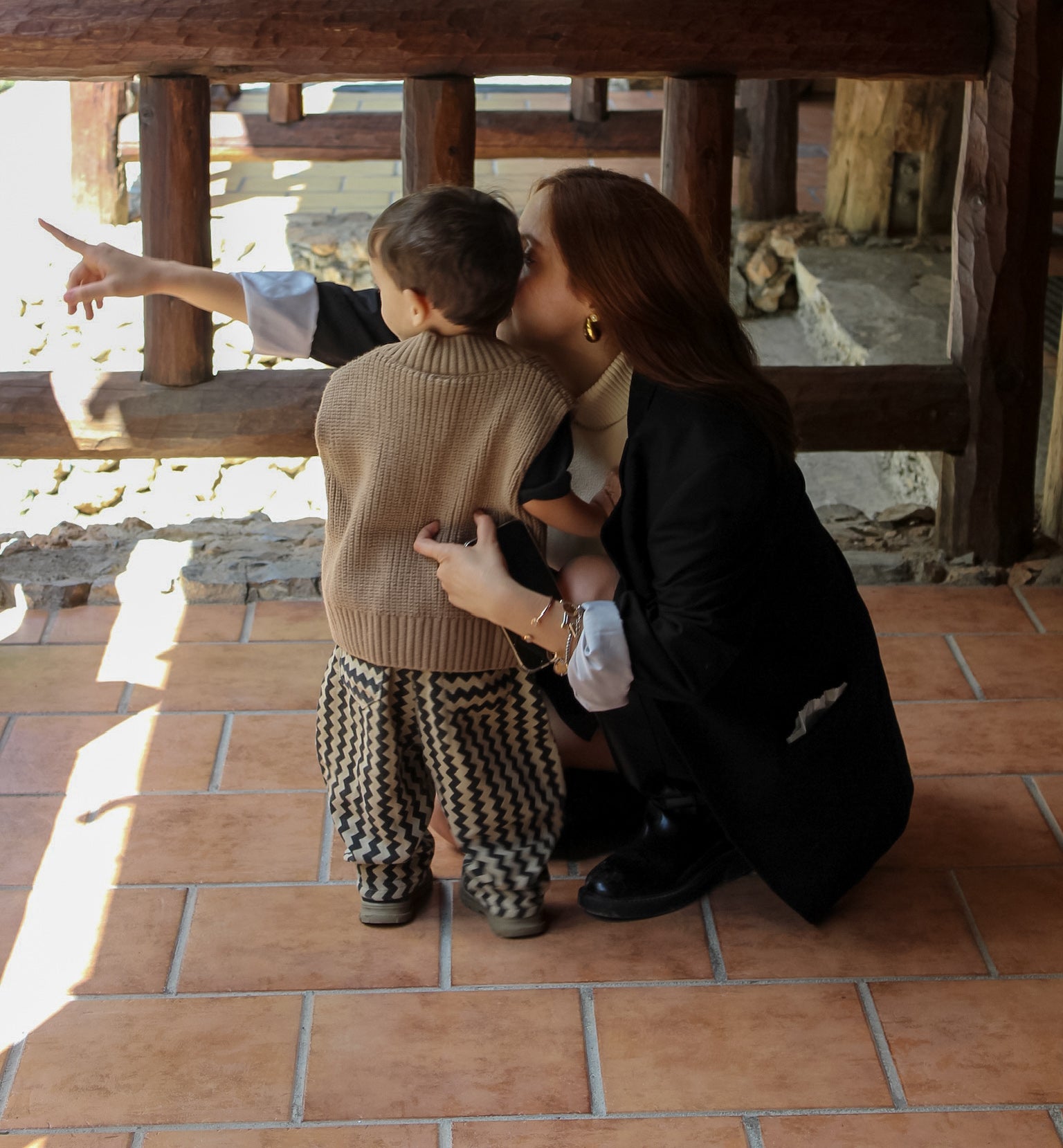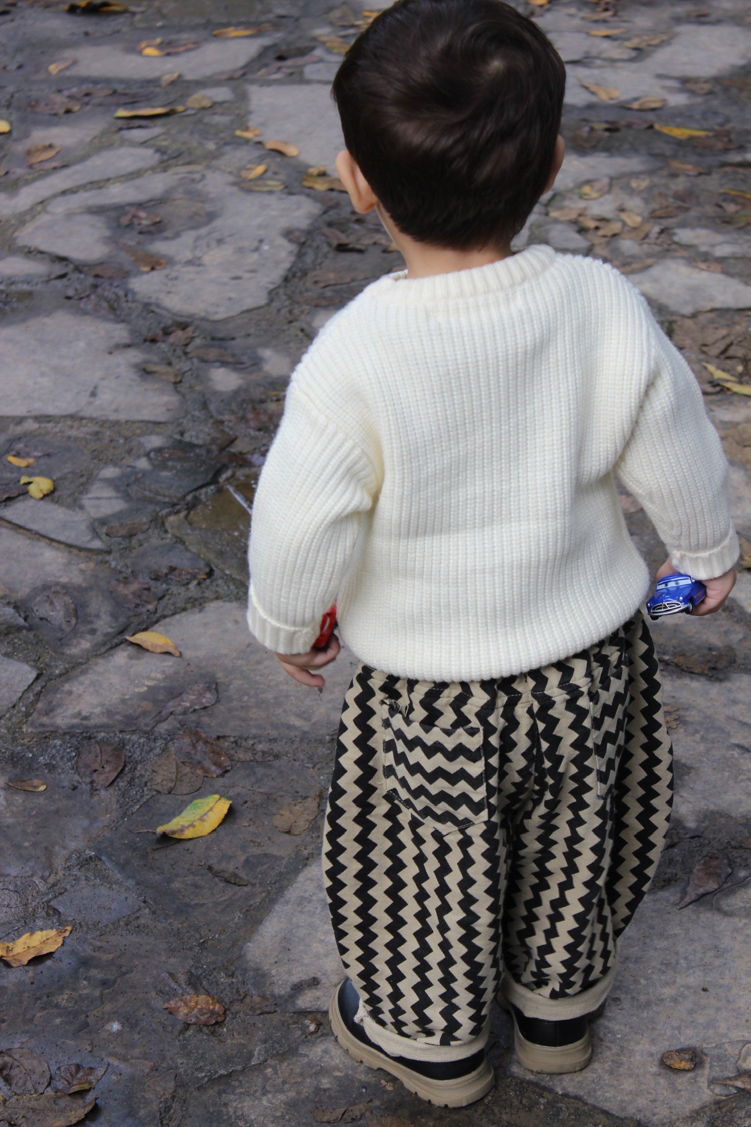 Pantalón de rayas en zigzag para niño con diseño divertido y versátil. Bolsillos traseros funcionales y silueta clásica con ajuste cómodo.
