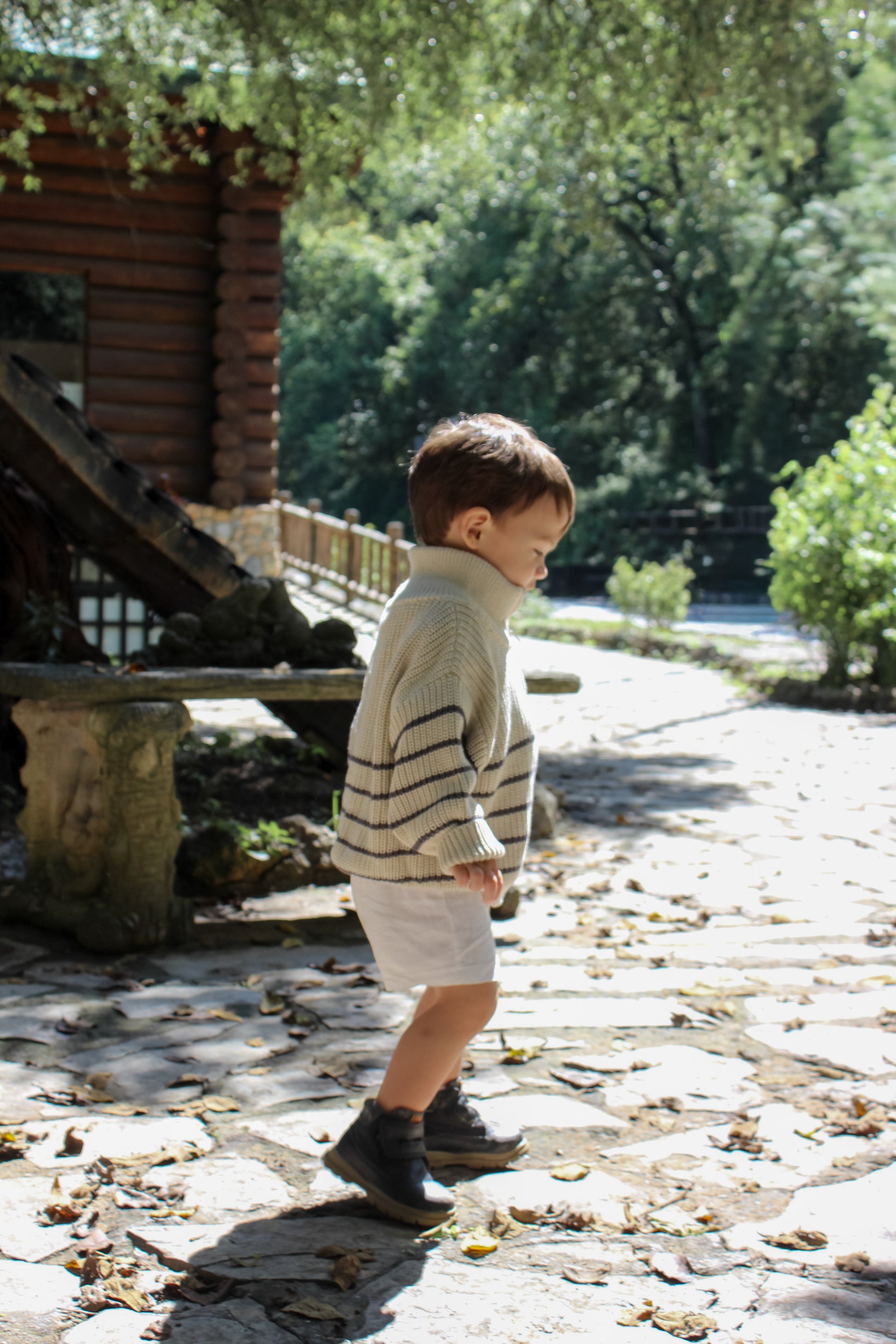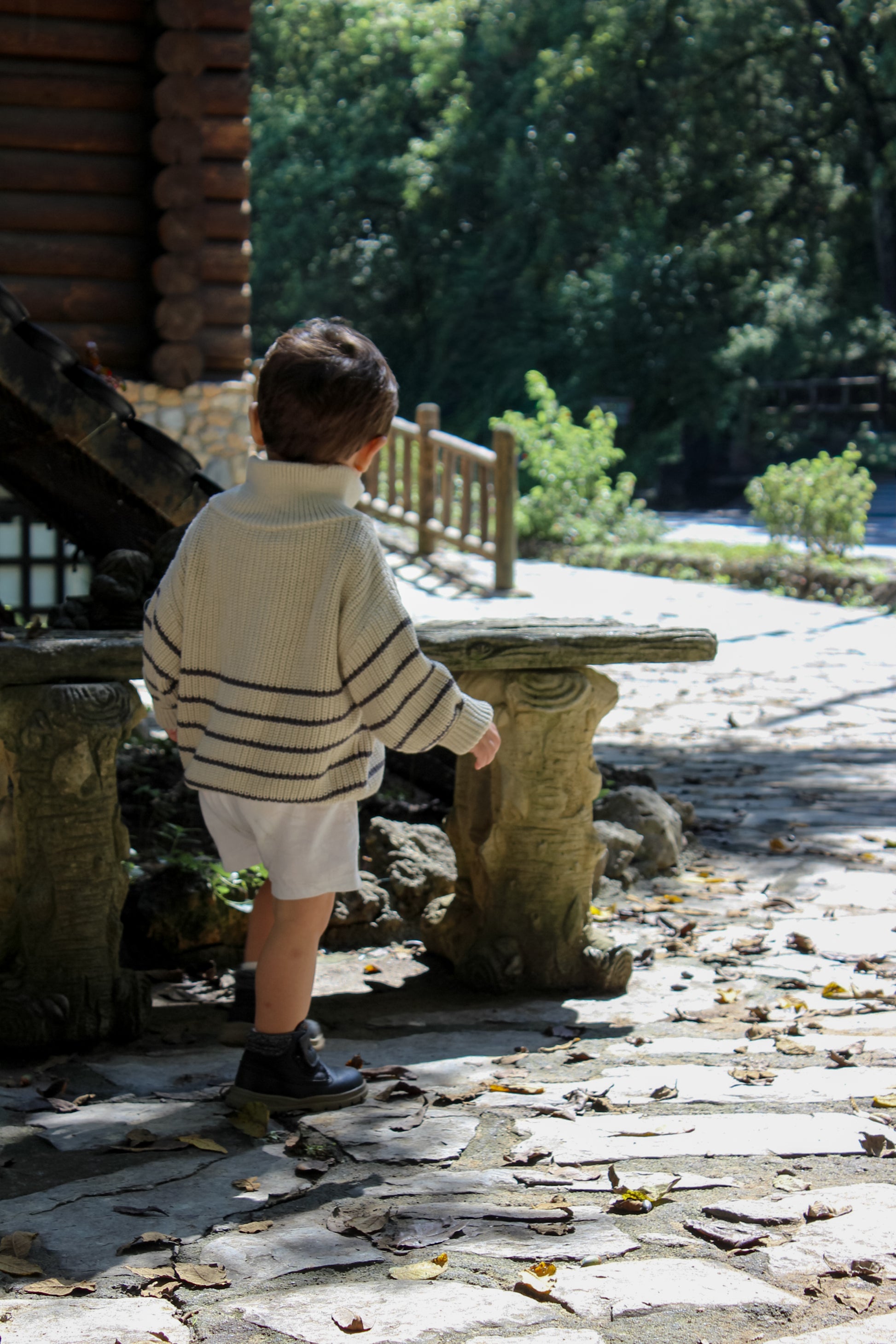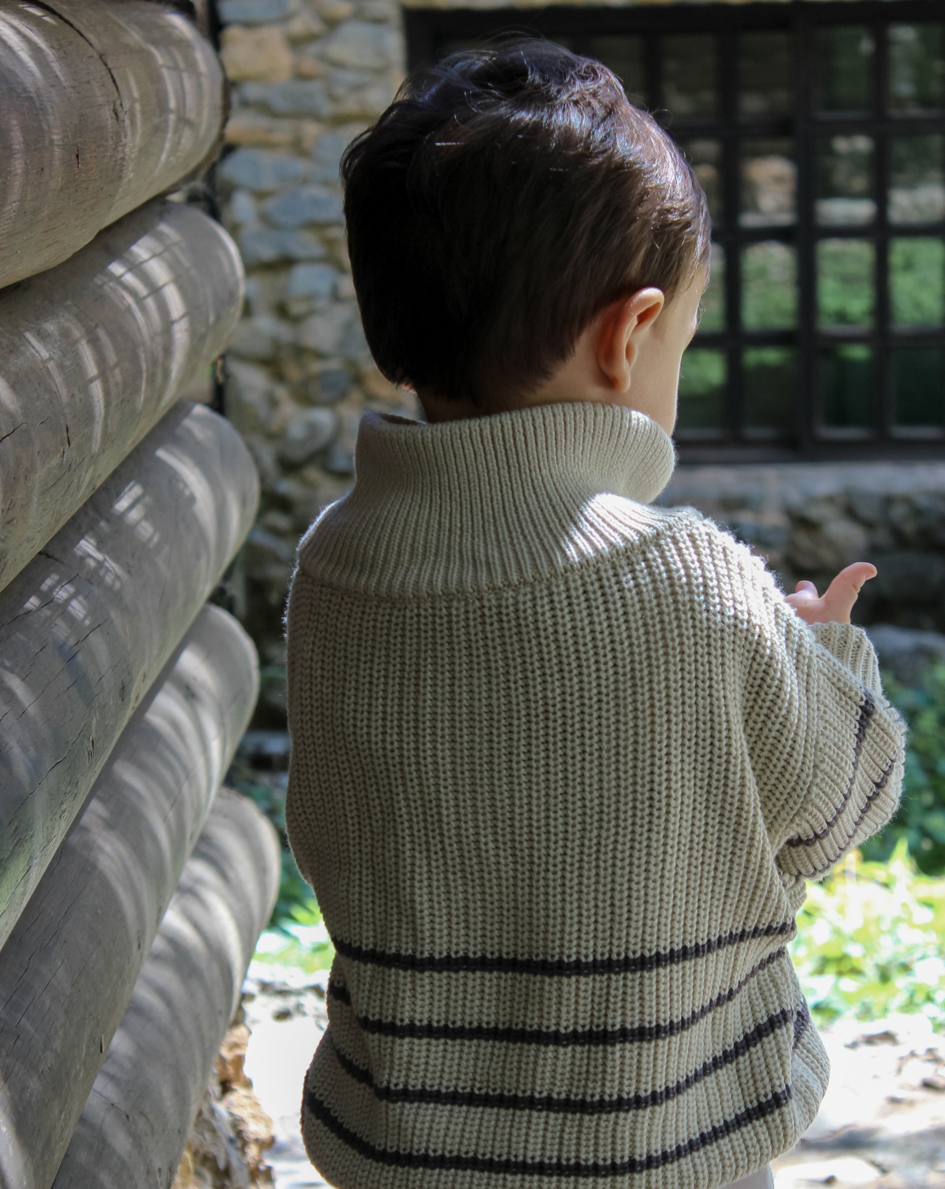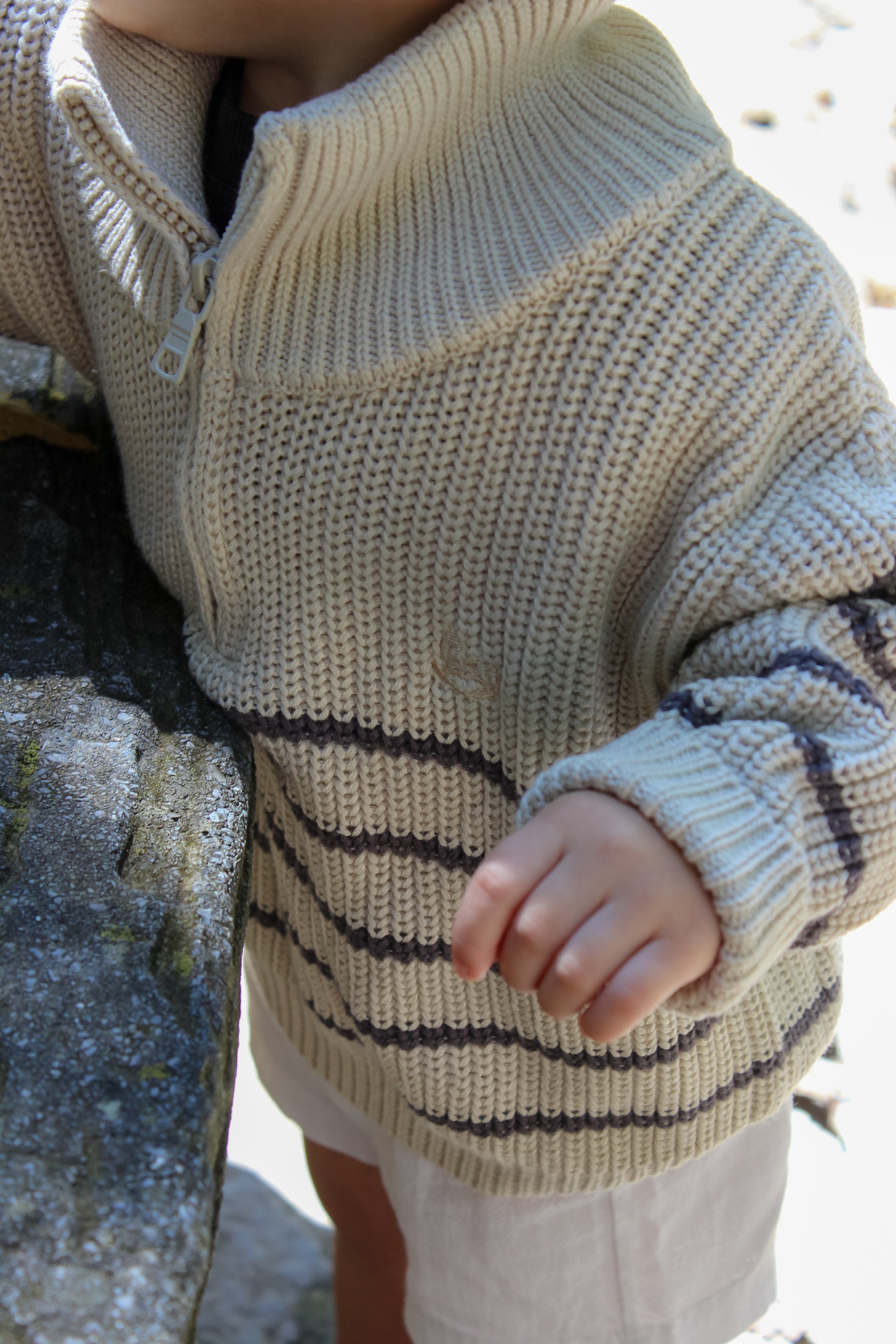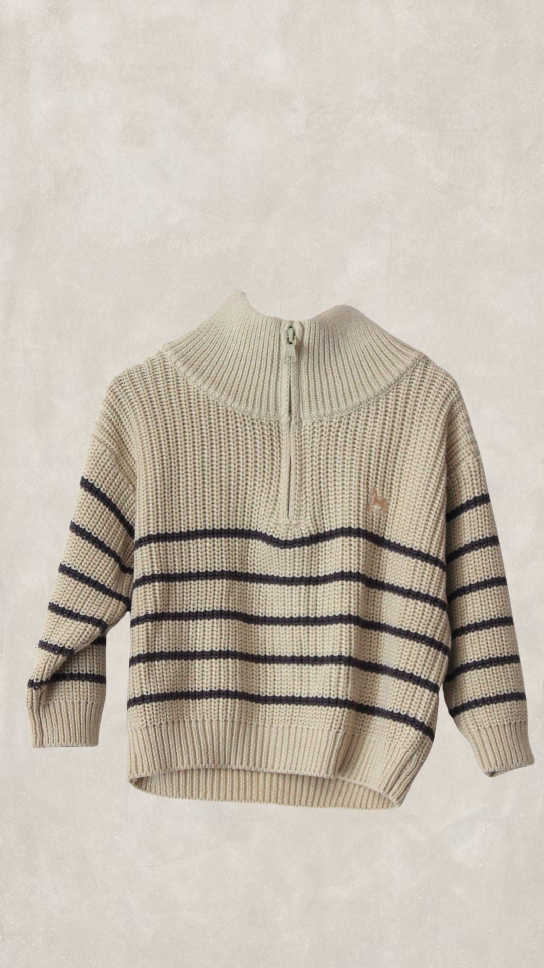 Suéter de punto con diseño de rayas y logo beige bordado en el pecho. Cuello con medio zíper para un fácil uso y un toque moderno. Ideal para mantener a tu pequeño abrigado y con estilo en cualquier ocasión.